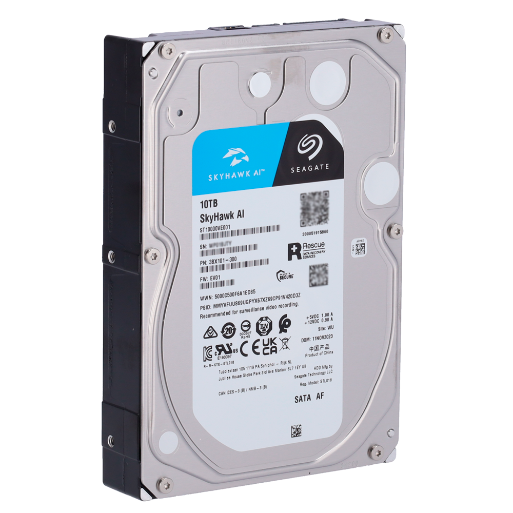 Modelo ST10000VE001 del fabricante Seagate. Diseño optimizado para los sistemas NVR con inteligencia artificial (IA) para aplicaciones de seguridad perimetral.