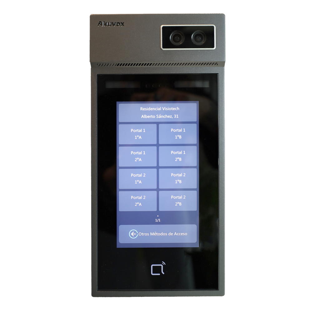 | Control de acceso | Apertura de puerta con reconocimiento facial, tarjeta RFID EM 125 kHz y MF 13.56 MHz, NFC, BLE, QR y PIN, con registros |