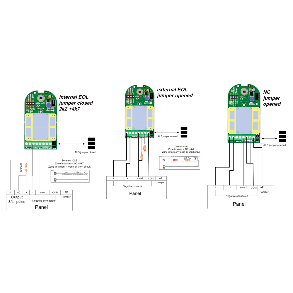 | Valores de resistencias fin de línea | Con los 3 jumpers: Reposo 2k2 Alarma 2k2+4k7 Tamper circuito abierto |