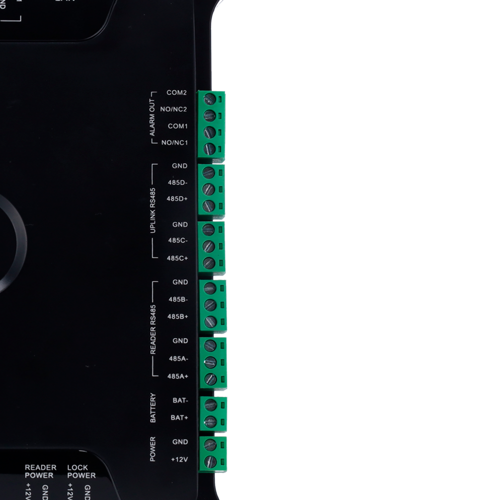 Esta controladora soporta lectores basados en el protocolo Wiegand, que permite la conexión a través de un cableado directo de cada lector a la controladora. Cuenta con 2 lectores para realizar entrada y salida en cada puerta y soporta lectores biométricos, que se conectan a través de RS485 y permiten la conexión a través de BUS (en cascada). Al soportar RS485, también soporta OSDP en el mismo conector, siendo este último personalizable en la configuración y permitiendo hasta 2 lectores por este método.