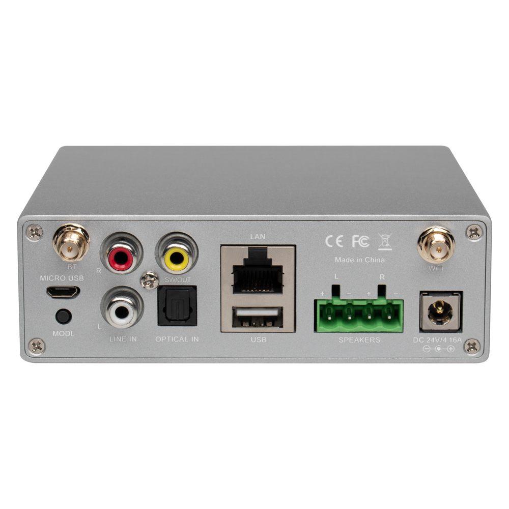 | Puertos | 1 x RJ45 (LAN 10/100MBps) 1 x USB 2.0 1 x Micro USB (conexión con PC) 1 x Antena Bluetooth 1 x Alimentación 1 x RCA (LINE IN) 1 x SUBWOOFER OUT 1 x SPDIF optical IN 2 x Salida de altavoces |