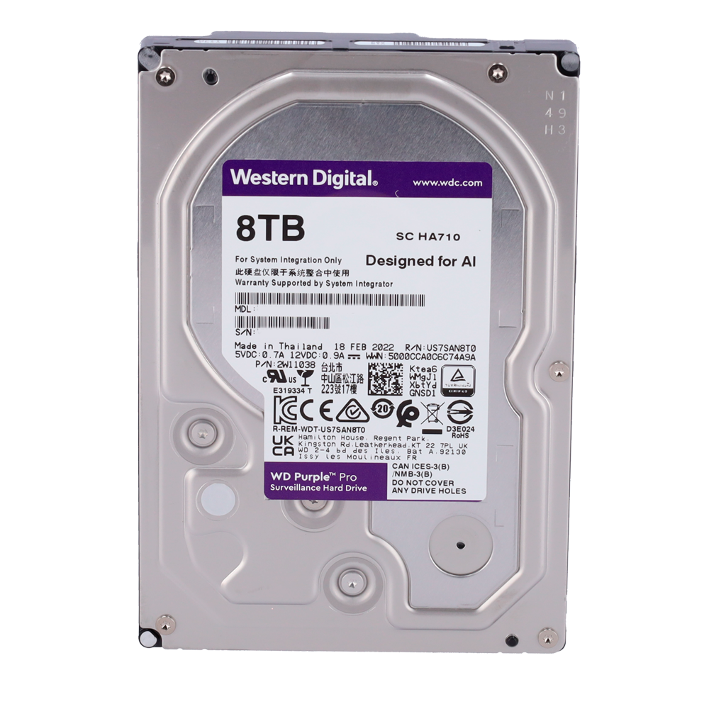 Modelo WD8002PURP del fabricante Western Digital. Diseñado especialmente para grabadores, servidores de análisis de vídeo y soluciones de Deep Learning avanzado con IA que necesitan más capacidad, rendimiento y características para cargas de trabajo.