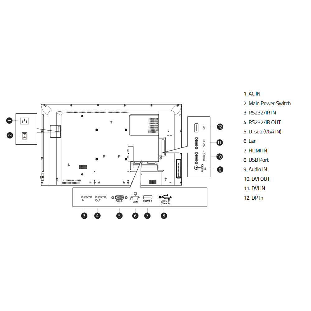 - Entrada HDMI, DVI, VGA, DP, USB, RS232