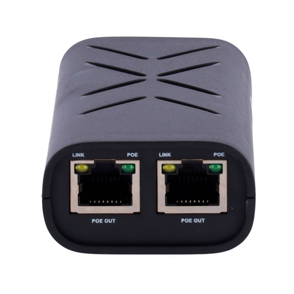 - Permite inyectar datos y alimentación en un cable UTP para alimentar 2 dispositivos PoE+ (hasta 30W cada uno) remotamente