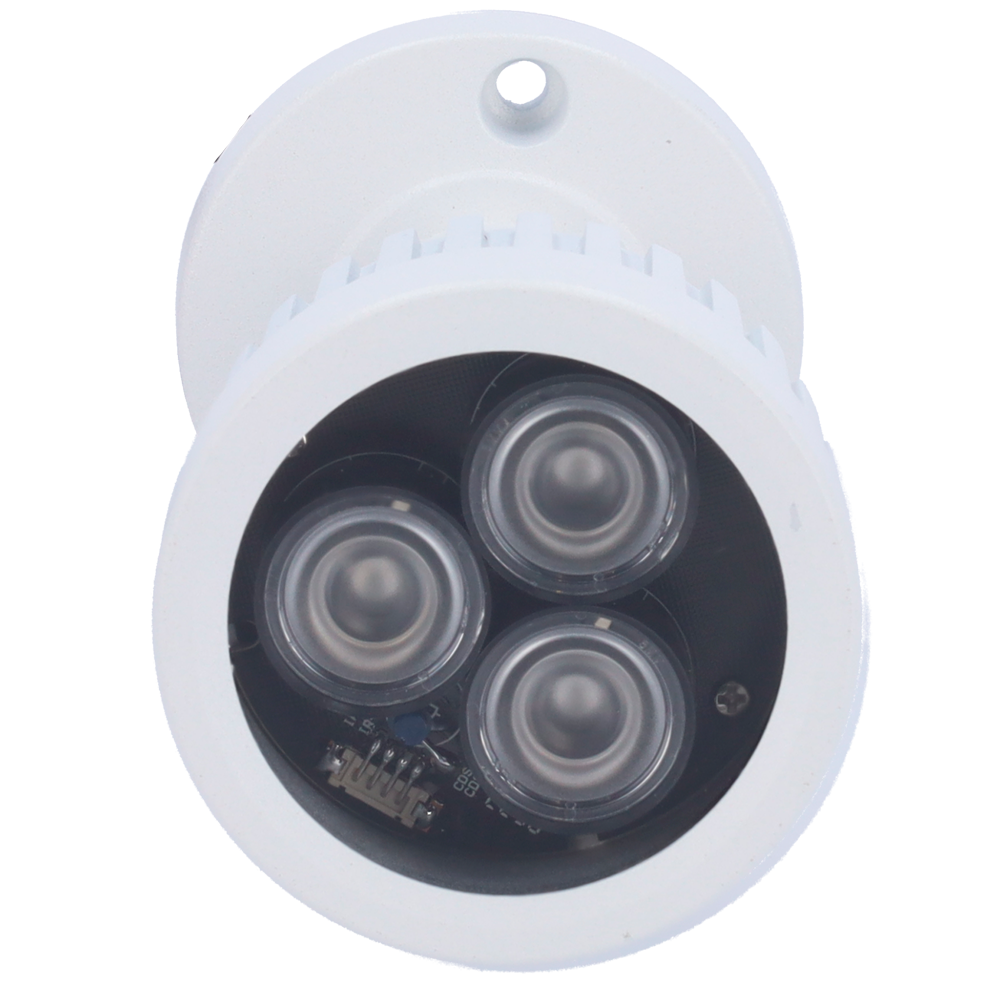 Resistente al agua, con protocolo de impermeabilización IP65, puede ser usado tanto para interior como para exterior. Dispone de una fotocélula para la activación automática de la iluminación infrarroja cuando las condiciones de luminosidad descienden por debajo de un cierto umbral. Por tanto, sus 3 LEDs infrarrojos se activan automáticamente, proporcionando una iluminación infrarroja para la visualización a través de cámaras de videovigilancia. Ángulo de apertura de 60º.