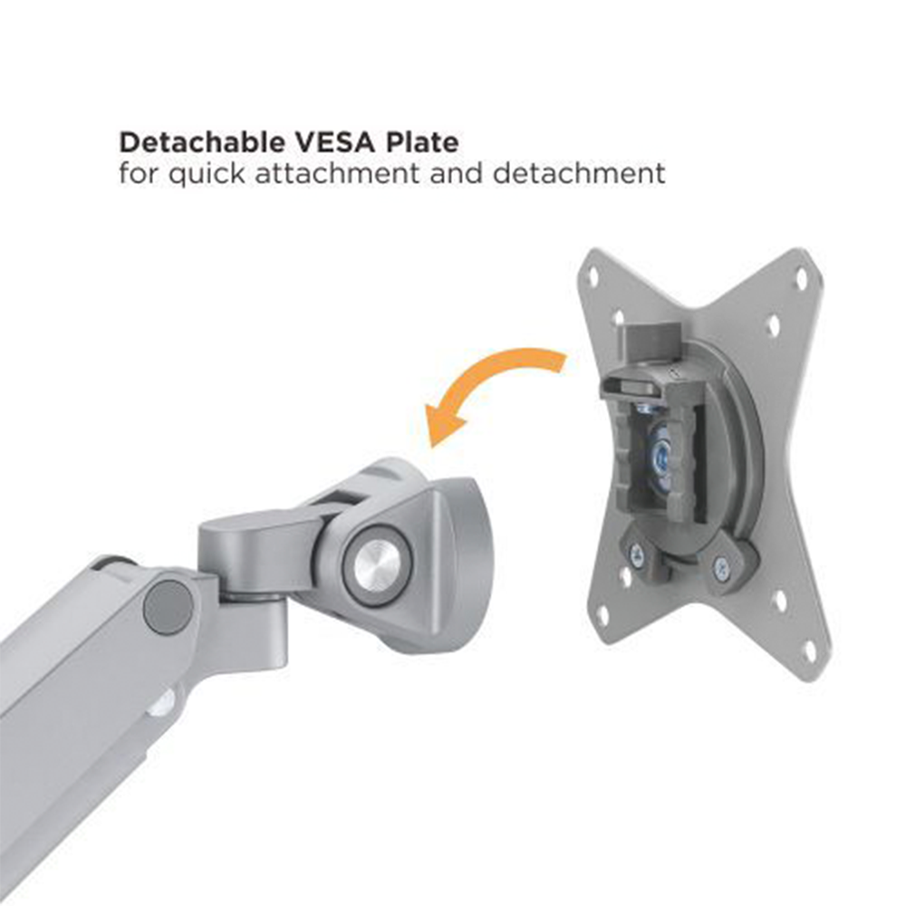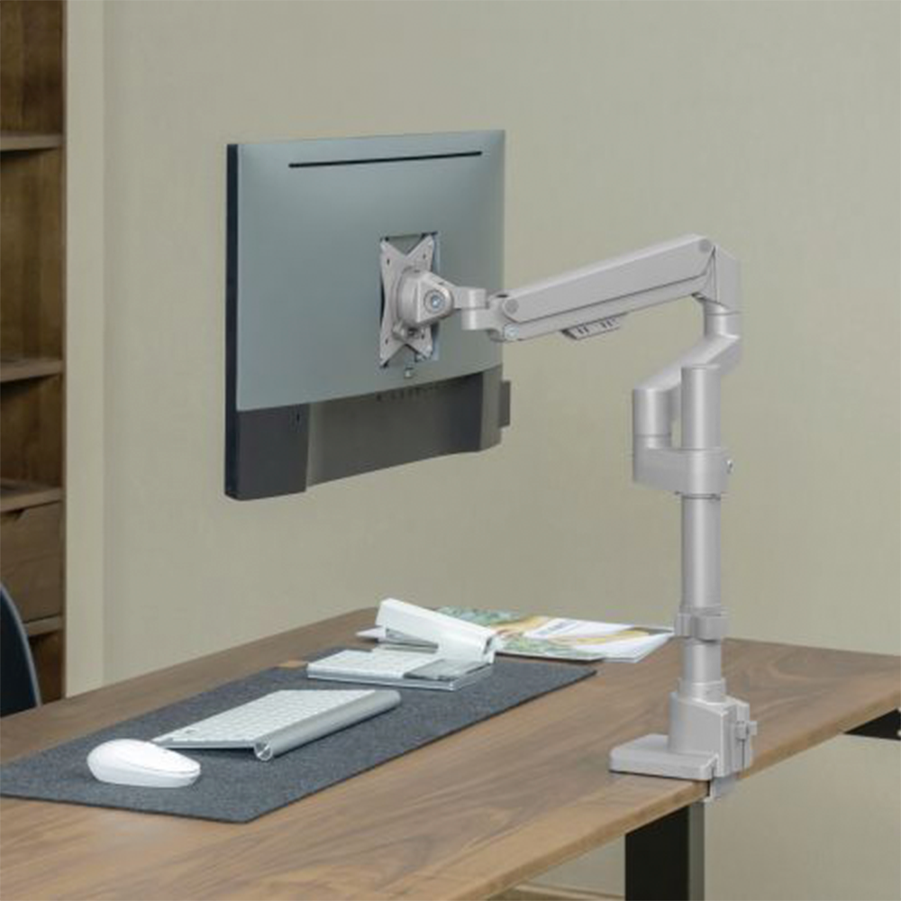 Un soporte de brazo de mesa para monitor es un accesorio diseñado para sostener y ajustar el monitor de forma ergonómica. Se fija al borde o a la superficie del escritorio mediante una base o abrazadera, y permite mover el monitor con libertad en diferentes direcciones: altura, inclinación, giro y distancia.