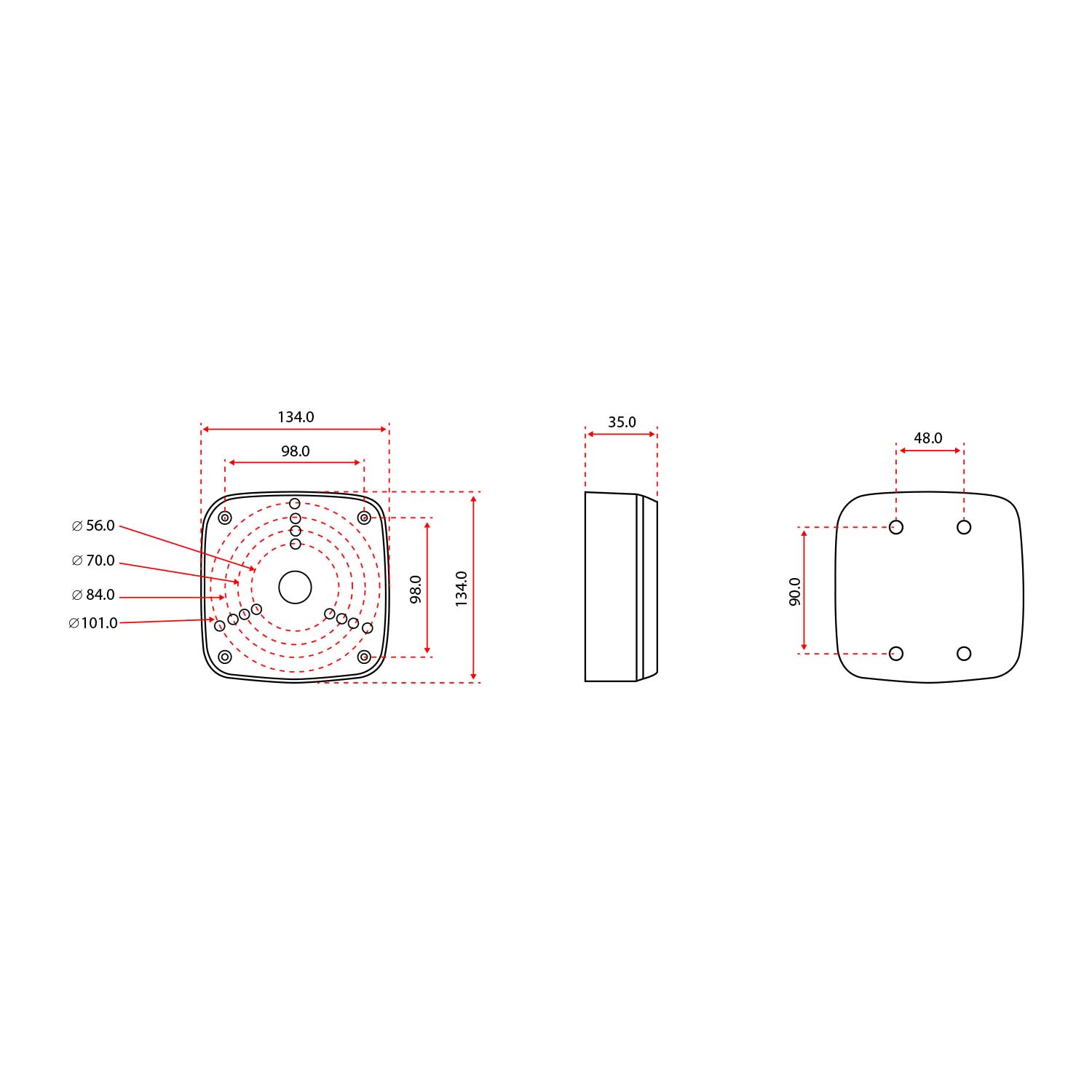 Permite alojar el alimentador, el cableado y los accesorios de la instalación en su interior. Dispone de múltiples orificios para instalación de diferentes tipos de cámaras bullet o domos. Fijación a pared o techo a través de 4 tornillos incluídos. La cámara queda instalada en la cubierta desmontable del soporte. Permite el paso interno del cableado.
