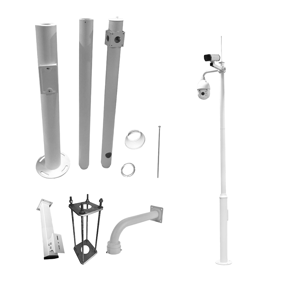 - Incluye un poste de base, un poste de instalación, un poste de extensión, un soporte para cámara bullet, un soporte para domo PTZ, un pararrayos y jaula de cimentación