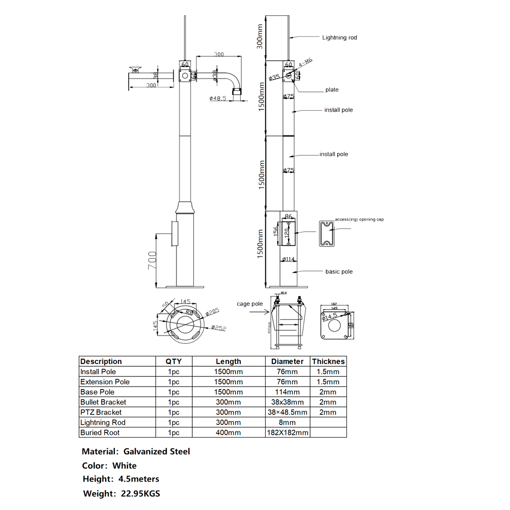 - Incluye un poste de base, un poste de instalación, un poste de extensión, un soporte para cámara bullet, un soporte para domo PTZ, un pararrayos y jaula de cimentación