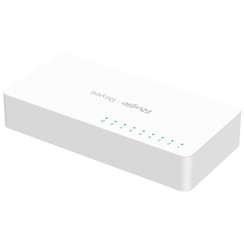 Su chasis de plástico de grado profesional en color blanco no solo le otorga una estética limpia y moderna, sino que asegura una ligereza excepcional para colocarlo en cualquier escritorio o estante. Al ser un dispositivo totalmente Plug-and-Play, no requiere ningún tipo de software o configuración; basta con conectar los cables para que el switch autogestione la mejor velocidad para cada equipo conectado. Gracias a su arquitectura “Fanless”, el equipo funciona en absoluto silencio, permitiendo un ambiente de trabajo tranquilo respaldado por la calidad de red de Ruijie.
