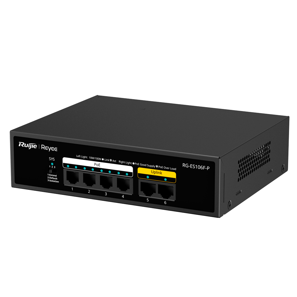 El Ruijie Reyee RG-ES106F-P es un switch PoE de 6 puertos diseñado para ofrecer una conectividad de alta fiabilidad en sistemas de seguridad y redes de pequeñas empresas. Al contar con un chasis metálico de grado profesional, este equipo asegura una durabilidad mecánica excepcional y una gestión térmica pasiva eficiente, eliminando la necesidad de ventiladores y permitiendo un funcionamiento totalmente silencioso. Sus 4 puertos PoE permiten centralizar la alimentación de cámaras IP, terminales de voz o puntos de acceso, reduciendo el desorden de cables y simplificando la infraestructura.