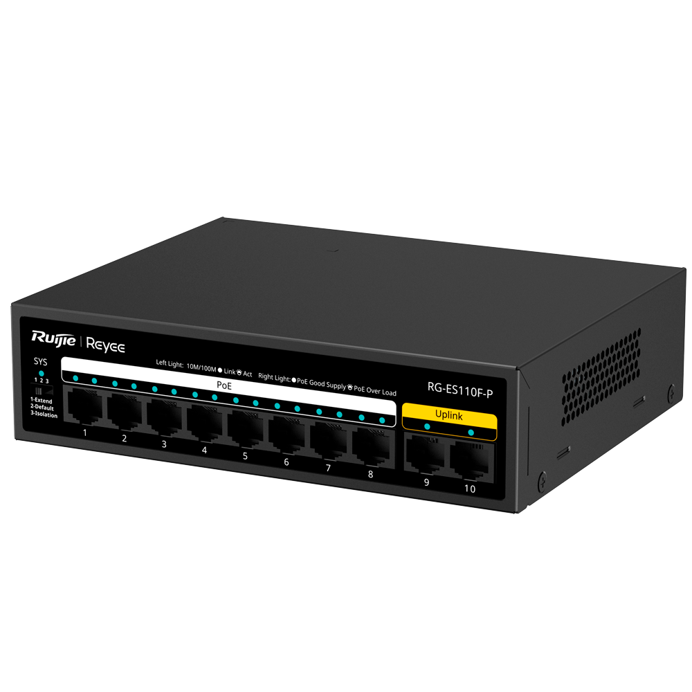 El Ruijie Reyee RG-ES110F-P representa el equilibrio perfecto entre potencia, durabilidad y simplicidad para sistemas de videovigilancia y redes comerciales de pequeño y mediano tamaño. Diseñado con un chasis metálico robusto, este switch garantiza una disipación de calor pasiva altamente eficiente, permitiendo un funcionamiento continuo 24/7 sin necesidad de ventiladores, lo que lo hace ideal para oficinas silenciosas o armarios de telecomunicaciones. Sus 8 puertos PoE permiten alimentar de forma centralizada cámaras IP, terminales de voz y puntos de acceso, mientras que sus dos puertos de enlace ascendente (Uplink) de 1000 Mbps aseguran que el tráfico masivo de datos hacia la red principal no sufra interrupciones ni retardos.