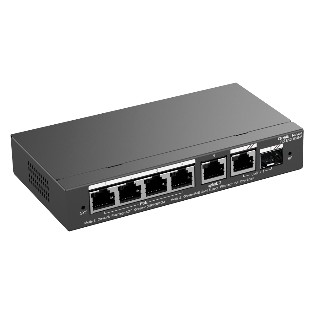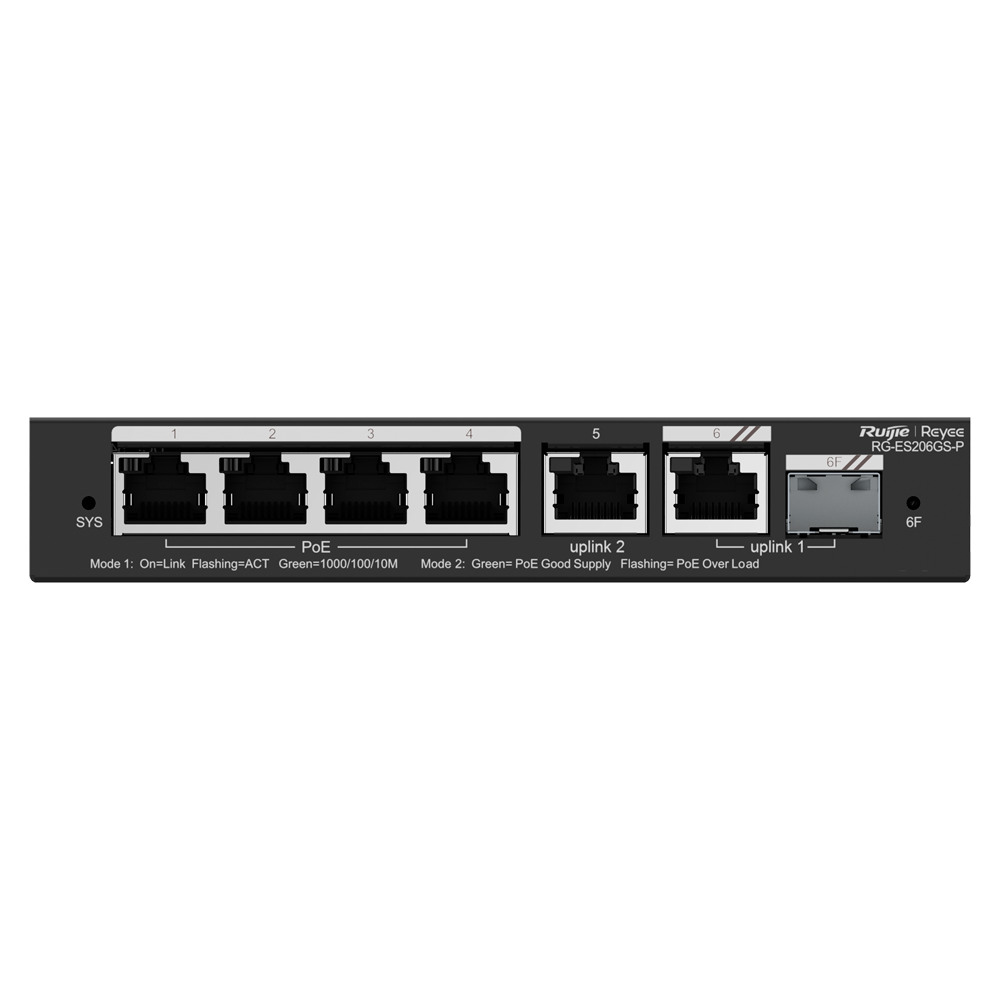 - 4 puertos RJ45 10/100/1000 Mbps + 2 puertos Uplink 10/100/1000 Mbps + 1 puerto SFP Combo Gigabit