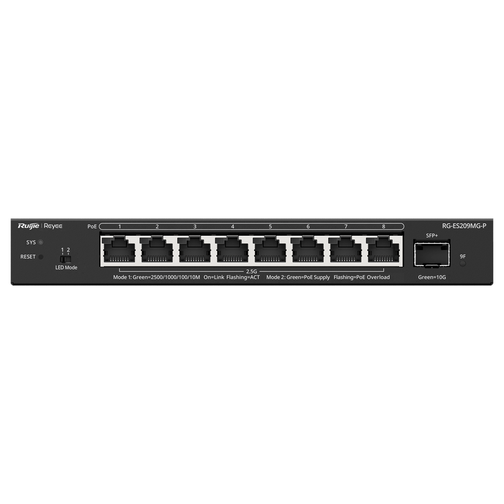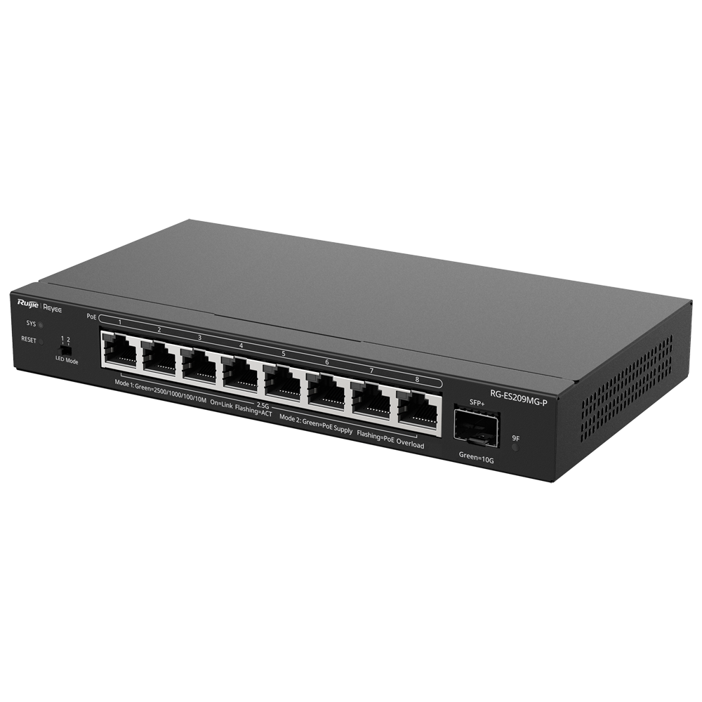 El RG-ES209MG-P de Ruijie Reyee es un switch gestionable de capa 2 con 8 puertos multigigabit 2.5G, 1 puerto SFP+ 10GbE y PoE+ en todos los puertos; entrega hasta 130 W totales para alimentar dispositivos IEEE 802.3af/at. Ofrece gestión cloud gratuita, fácil configuración web y app, y es ideal para aprovechar Wi-Fi 7 y maximizar el rendimiento en redes de oficina o pequeños proyectos empresariales. Su diseño fanless lo hace silencioso, permite instalación en escritorio o pared y tiene protección avanzada eléctrica y funciones como VLAN, aislamiento de puertos y DHCP snooping para seguridad y eficiencia.