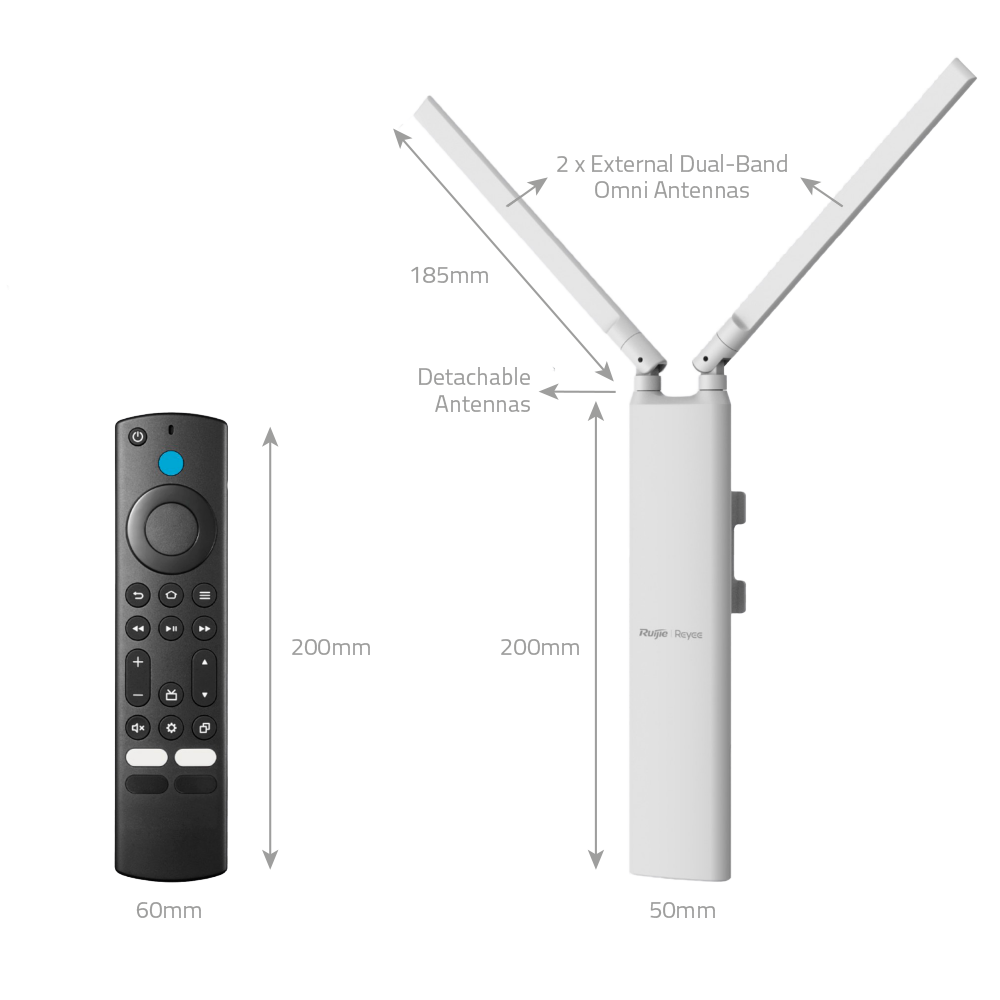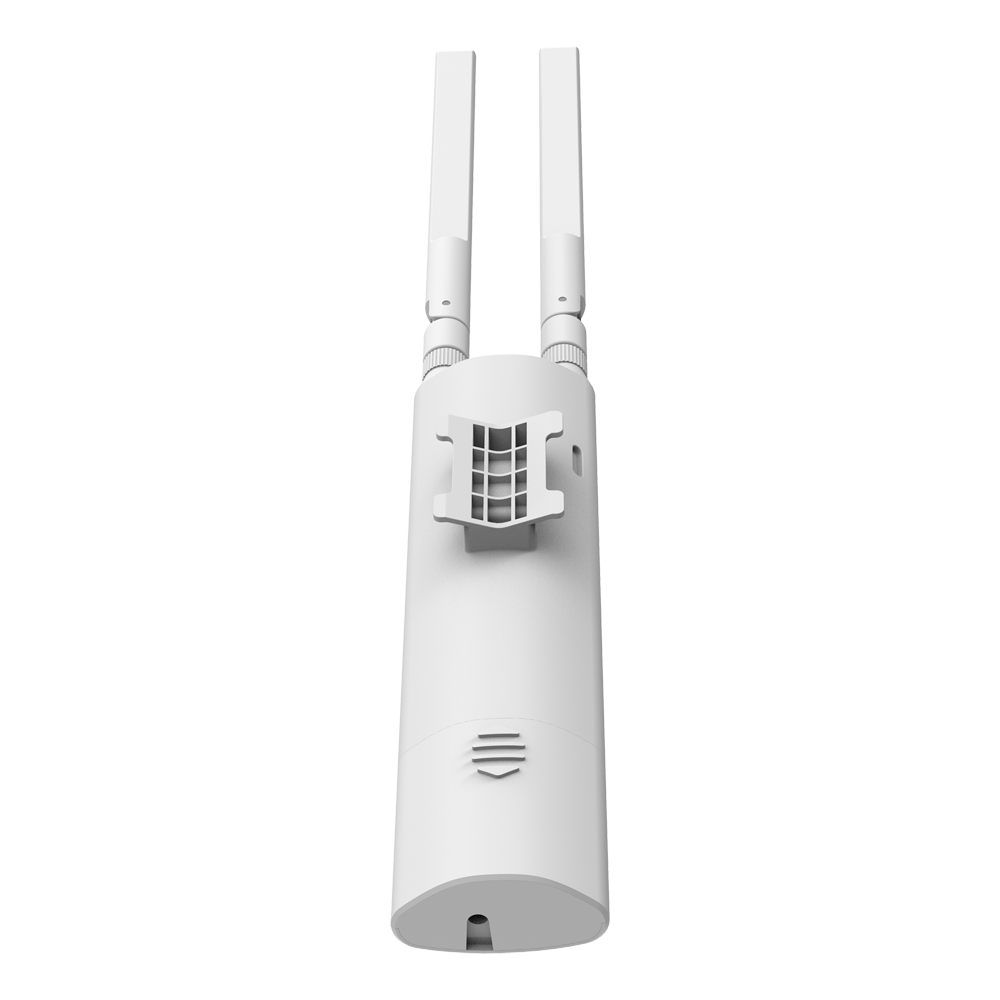 Este punto de acceso inalámbrico para exteriores de la línea Reyee implementa el estándar Wi-Fi 5 (802.11ac Wave 2), ofreciendo una velocidad inalámbrica combinada de hasta 1267 Mbps. Su diseño destaca por un chasis cilíndrico extremadamente compacto y discreto, ideal para instalaciones en fachadas de viviendas, villas o terrazas comerciales donde se busca minimizar el impacto visual. Cuenta con certificación IP65, lo que garantiza una protección total contra el polvo y resistencia a chorros de agua, manteniendo un funcionamiento estable en un rango de temperatura extendido de -30 °C a 70 °C.
