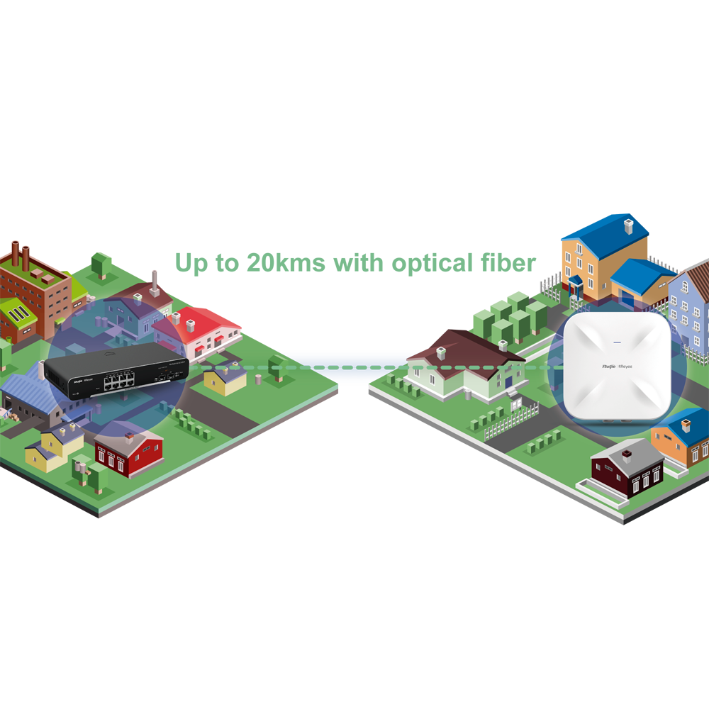 El dispositivo utiliza antenas omnidireccionales de alta ganancia para ofrecer una cobertura de 360 grados, optimizada mediante tecnologías MU-MIMO 2×2 y OFDMA para mantener la eficiencia con múltiples usuarios concurrentes. Soporta alimentación mediante PoE (802.3at) y cuenta con protección contra sobretensiones de hasta 6 kV. Gracias a la gestión en Ruijie Cloud, permite una configuración simplificada mediante redes auto-organizadas (SON), facilitando el monitoreo remoto y la optimización de la red en tiempo real sin costos de licencia adicionales.