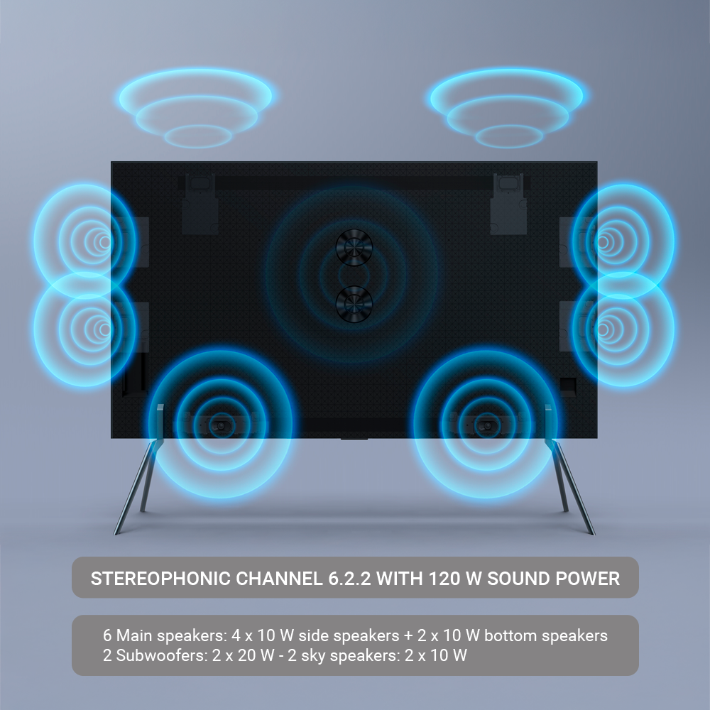 | Altavoces | Potencia total de 120 W, dividida en: Superiores: 2×10 W Laterales: 4×10 W Inferiores: 2×10 W Subwoofer: 2×20 W Respuesta en frecuencia: 40 Hz – 20 kHz |