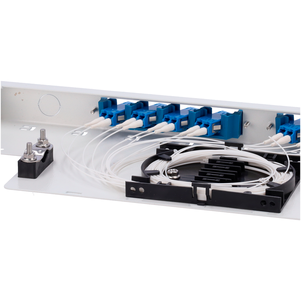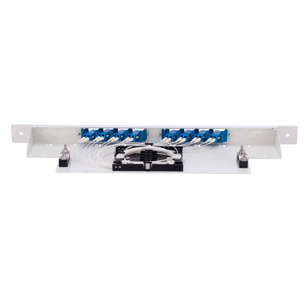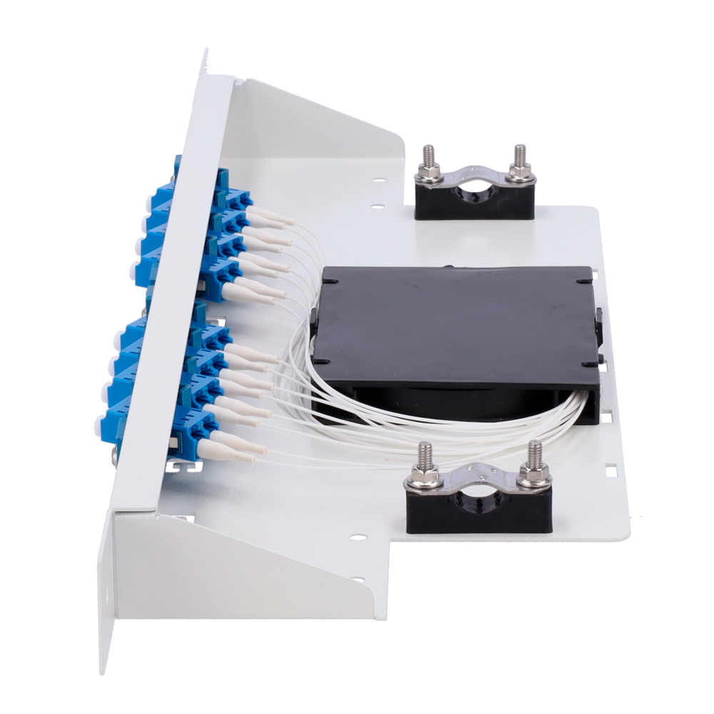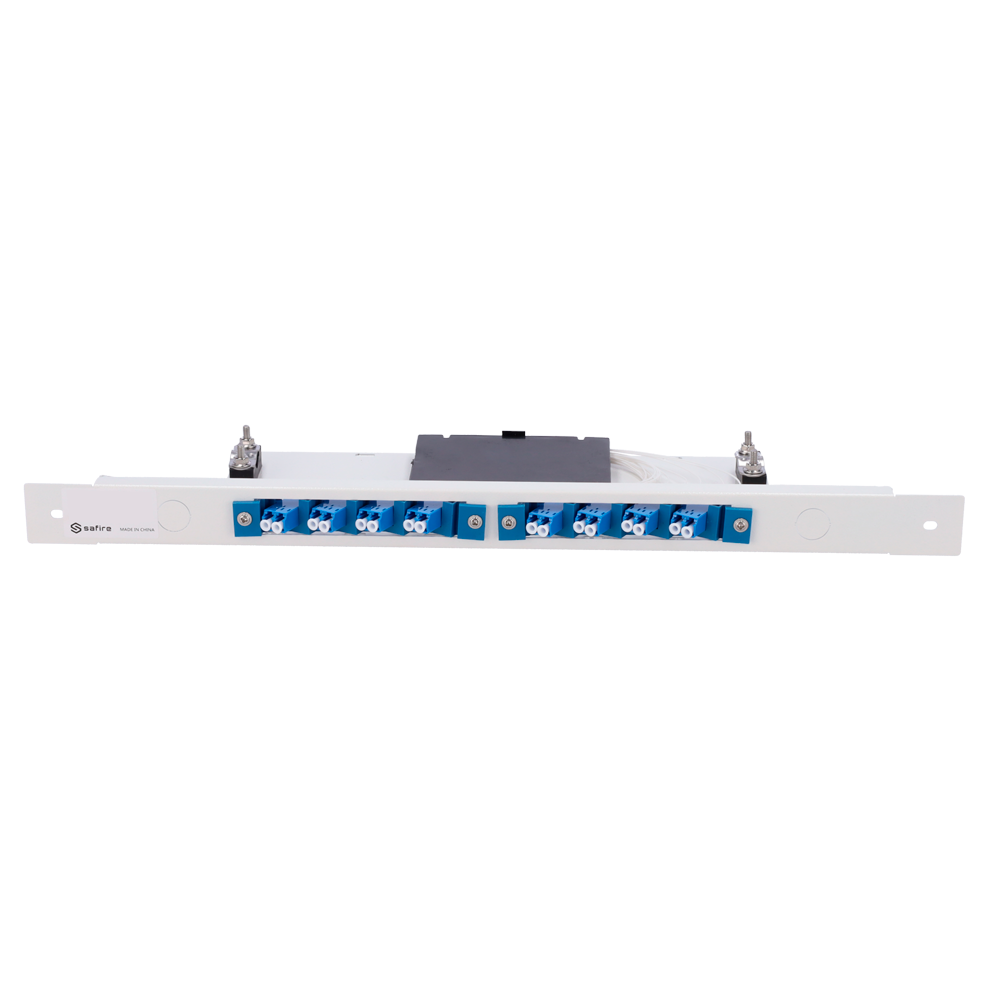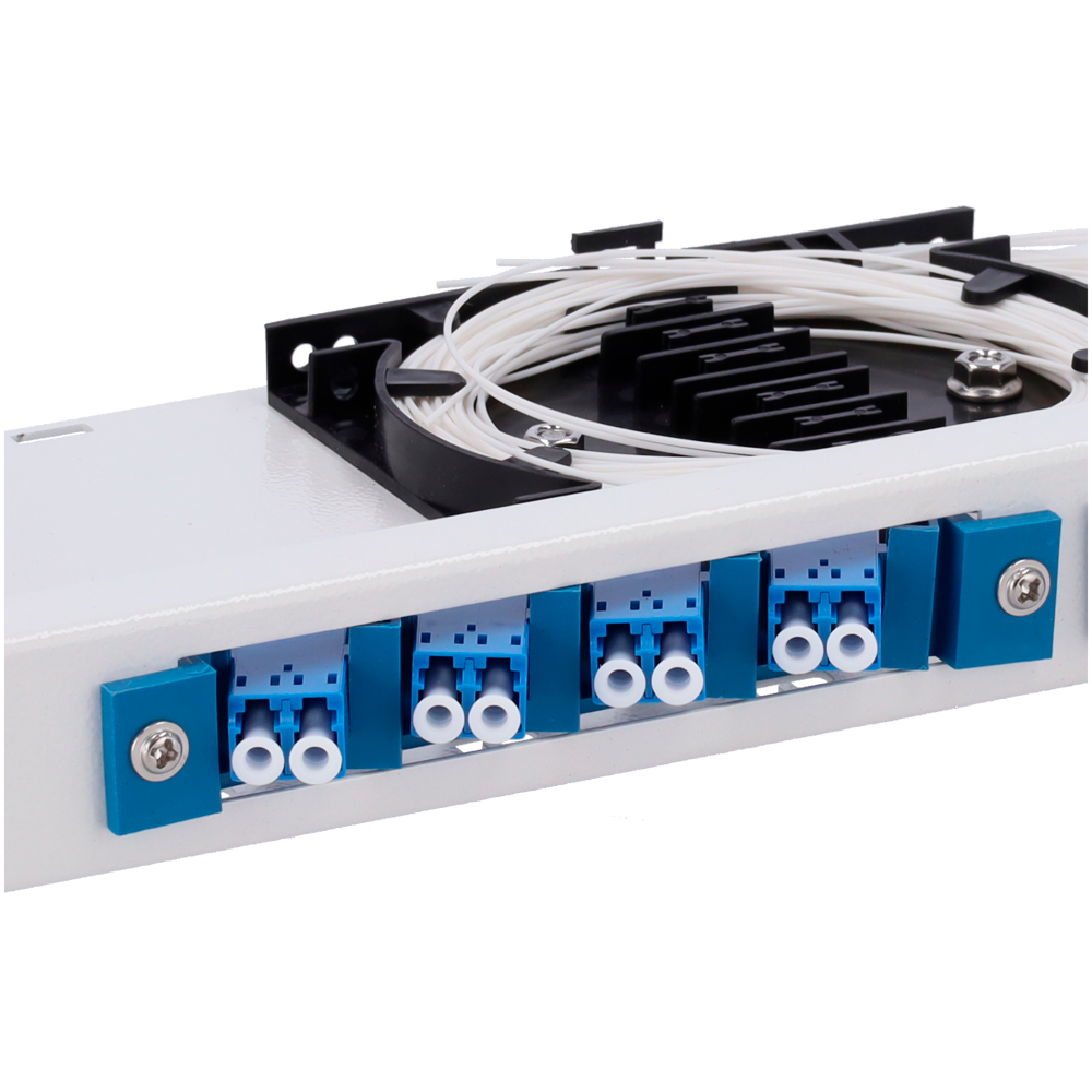 Patch panel de fibra óptica con 8 conectores LC, fácil montaje.