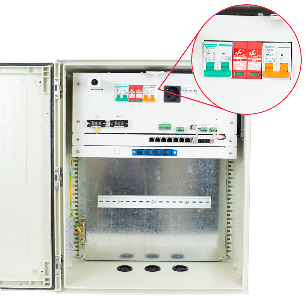 Armario de conexiones inteligente con posibilidad de conectar batería de backup AGM de 12 voltios. Software de supervisión gratuito, switch de 8 bocas, 3 salidas de 12V 3 amperios por boca y patch panel de fibra. Sensor de puerta con iluminación interna LED automática y doble cierre. Carril DIN para sujeción de dispositivos adicionales