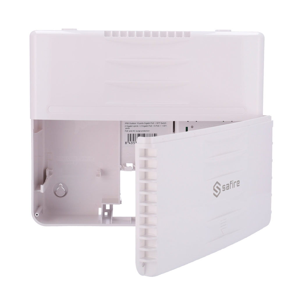 El Safire SF-SW1108HIPOE-HF-120-OUT es un switch de grado industrial diseñado para sobrevivir donde los equipos convencionales fallan. Su apellido “OUT” y su arquitectura hardened lo convierten en el componente ideal para cajas de comunicaciones en exteriores, postes o entornos industriales con temperaturas extremas. No solo es resistente, sino extremadamente potente: sus dos ultimos puertos entregan hasta 60W (Hi-PoE), permitiendo alimentar cámaras PTZ motorizadas con calefacción o iluminadores infrarrojos de largo alcance sin pestañear.
