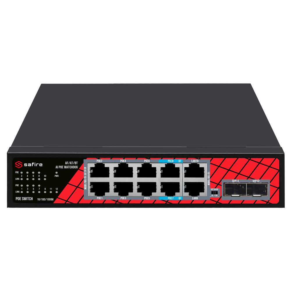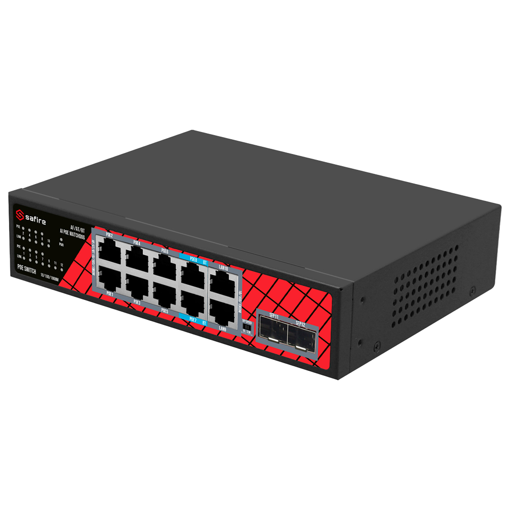 - 8 puertos PoE + 2 SFP + 2 RJ45