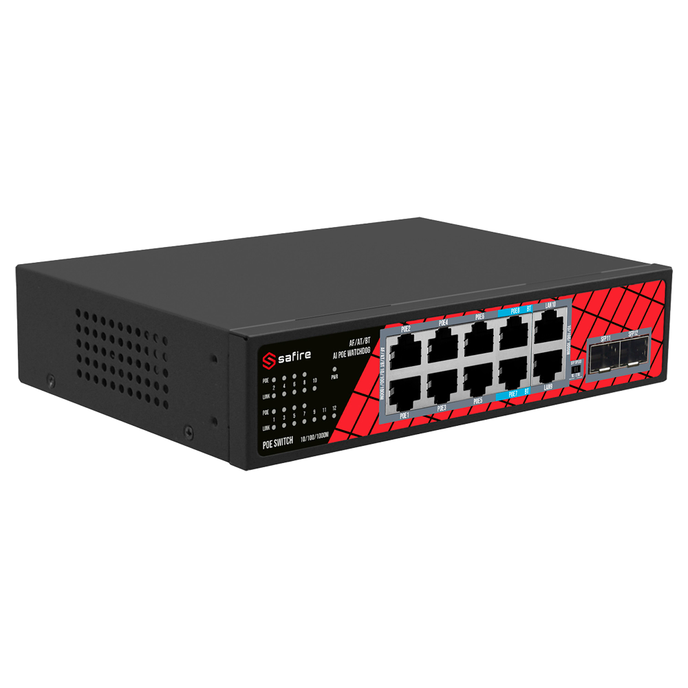 El Safire SF-SW1208HIPOE-GMF-120 es una estación de potencia y datos diseñada para infraestructuras que exigen lo máximo en versatilidad. Su configuración “GMF” (Gigabit, Metal, Fiber) lo posiciona como un nodo central extremadamente capaz: no solo ofrece 8 puertos de acceso Gigabit alimentados, sino que cuenta con cuatro puertos Uplink dedicados. Esta generosa conectividad permite conectar dos grabadores o servidores por cobre y, simultáneamente, mantener dos enlaces de fibra óptica (SFP) para redundancia o expansión a larga distancia, algo vital en instalaciones de seguridad modernas.