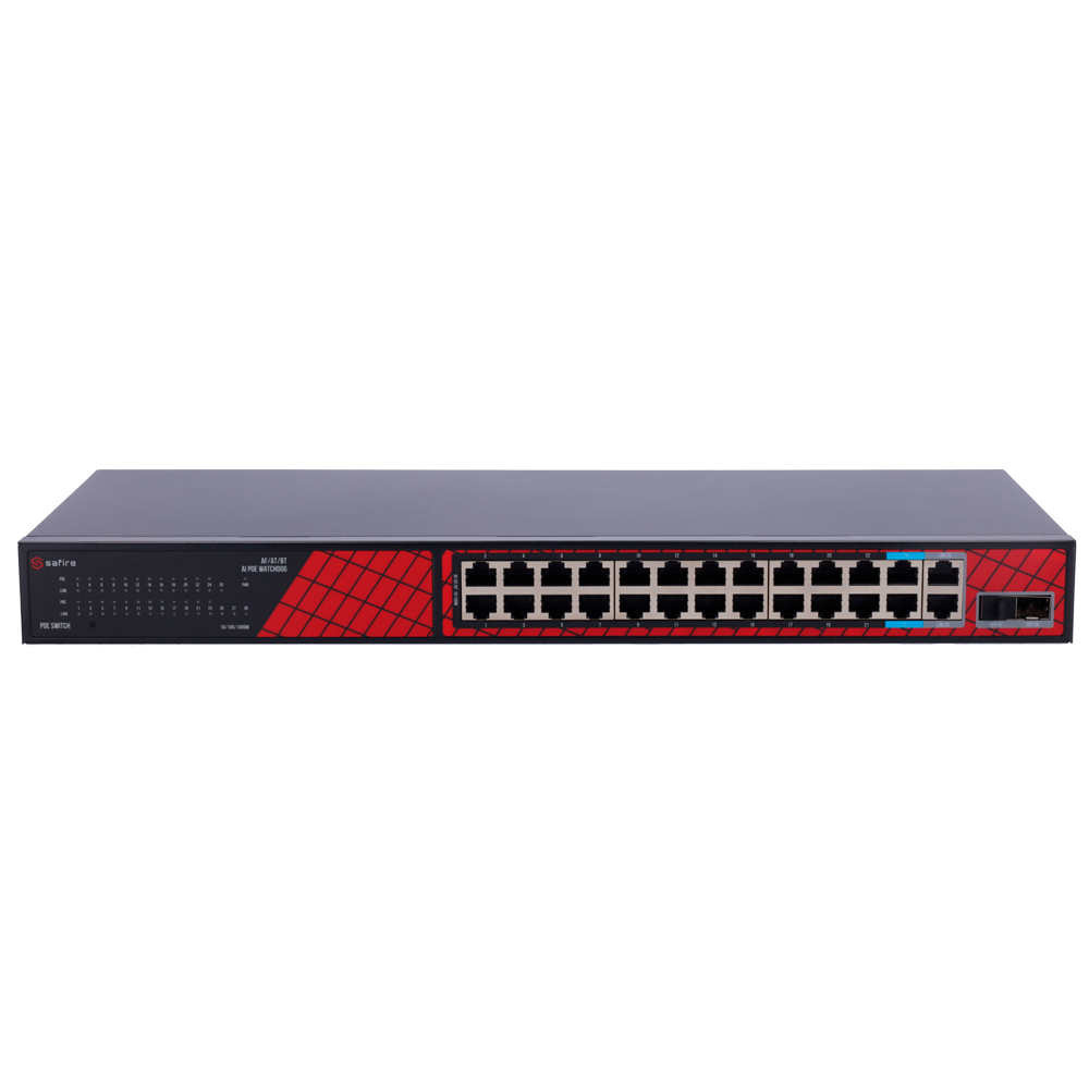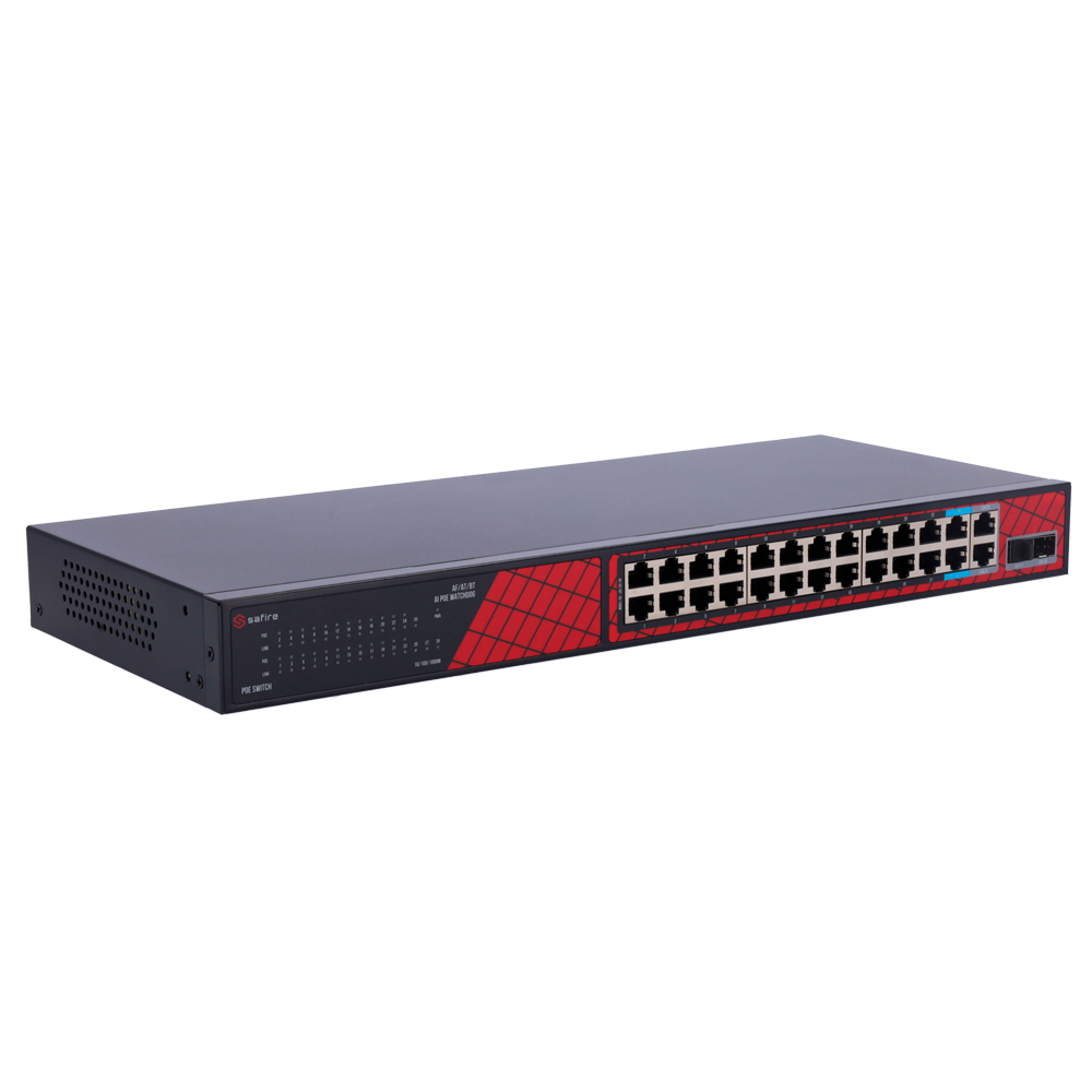 | Interfaces | 24 puertos RJ45 PoE + 2 Uplink RJ45 + 2 Uplink SFP |
