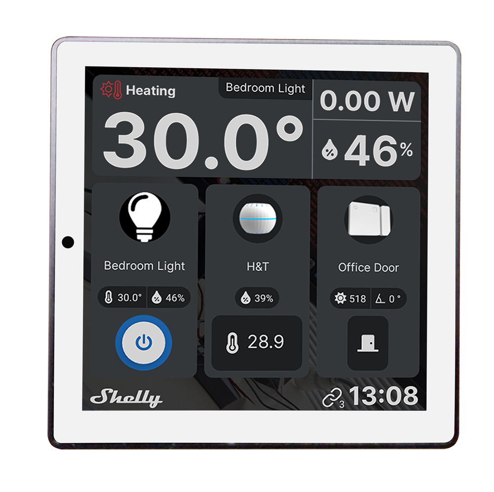 - Pantalla de pared intuitiva de 4” permite un monitoreo centralizado de todos tus dispositivos Shelly