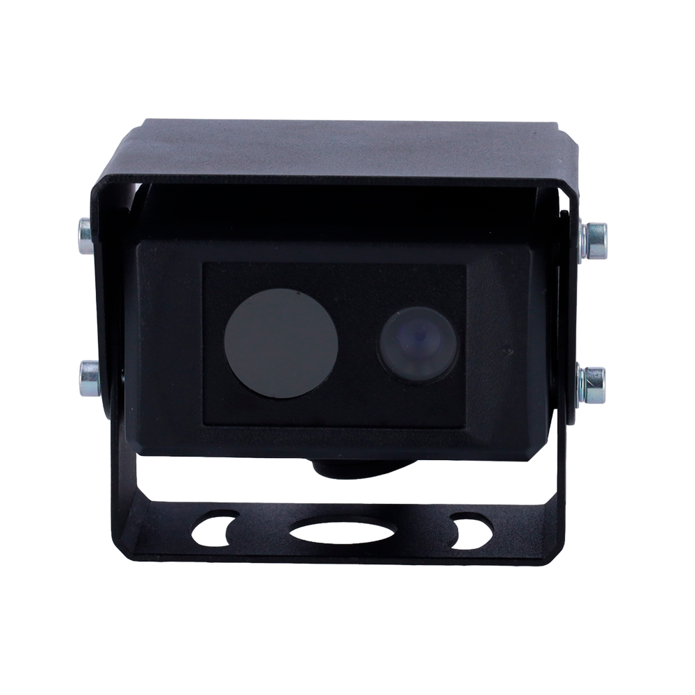 Cámara térmica para vehículos con detección de colisión por IA. Lente dual visible y térmica con rango de detección hasta 50 metros. Resistente al agua IP69K, requiere herramienta STK-AC575 para configuración. Ángulos de visión en horizontal de 28º en térmico y 40º en visible. Resolución 2MP en visible.