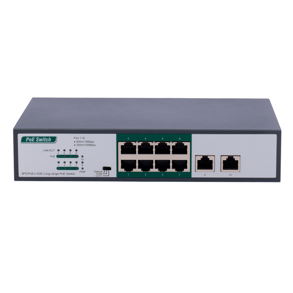 - 8 puertos PoE+ RJ45 10/100 Mbps + 2 puertos RJ45 Gigabit