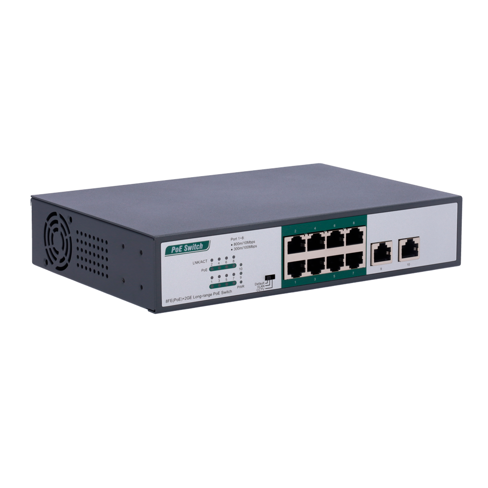 El SW1008POE-H-800M-120W se define como una solución de conmutación de alto rendimiento especializada en despliegues de videovigilancia de gran escala, donde las distancias de transmisión superan ampliamente los límites convencionales de la normativa Ethernet. Su arquitectura física integra una matriz híbrida compuesta por 8 puertos de acceso 10/100 Base-TX con soporte Power over Ethernet y 2 puertos de enlace ascendente 10/100/1000 Base-T independientes, lo que permite una capacidad de conmutación de 5.6 Gbps. Esta configuración garantiza una convergencia de datos fluida entre dispositivos periféricos y nodos troncales, eliminando cuellos de botella mediante sus interfaces Gigabit dedicadas para la salida de tráfico hacia grabadores NVR o routers centrales.