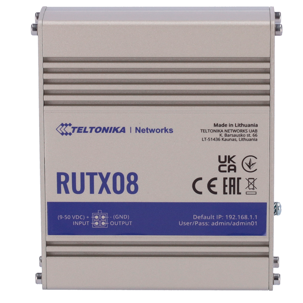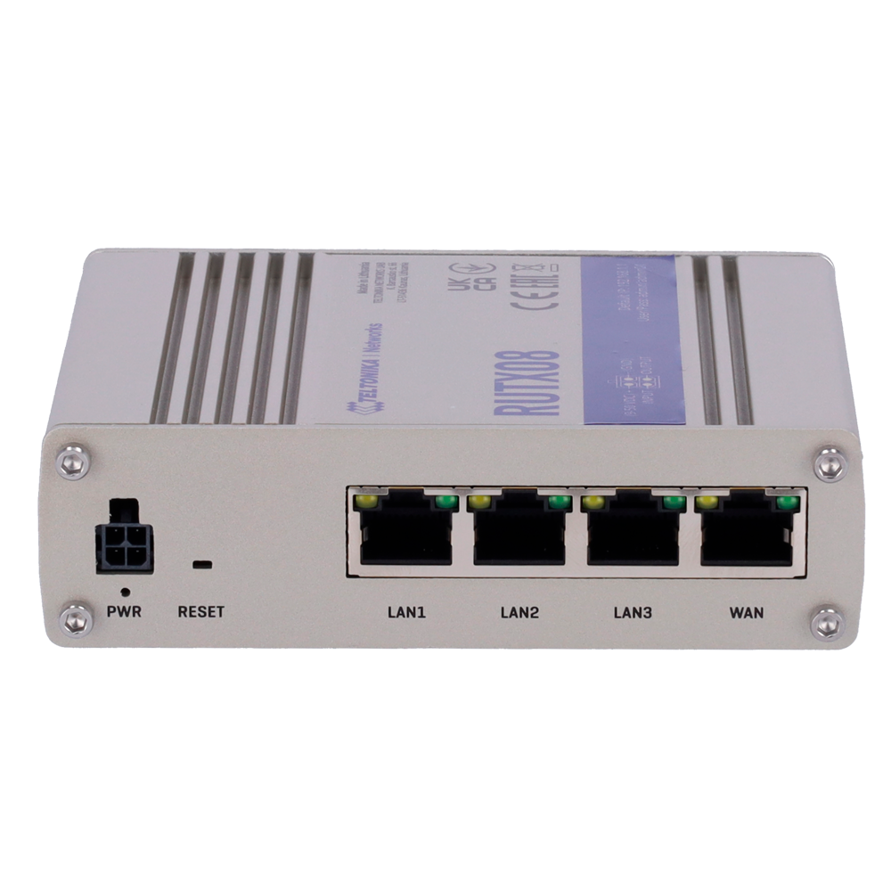 El Teltonika RUTX08 (TK-RUTX08) es un router industrial de alto rendimiento diseñado para aplicaciones M2M y soluciones de red cableadas que exigen una fiabilidad extrema y un procesamiento de datos superior. Este modelo destaca por su arquitectura robusta, equipada con 4 puertos Gigabit Ethernet (1 WAN + 3 LAN) y un procesador Quad-core de 717 MHz con 256 MB de RAM, lo que le permite alcanzar un throughput de hasta 1 Gbps para gestionar infraestructuras locales con gran fluidez.