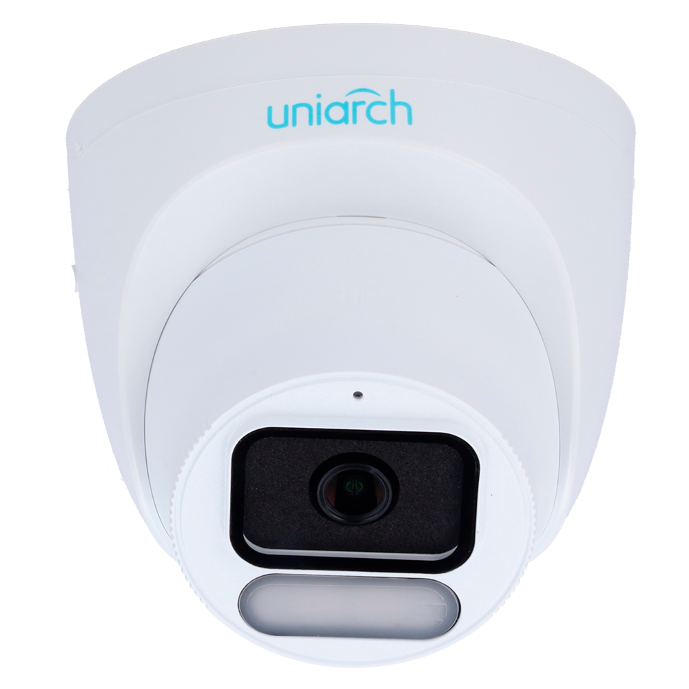 Cámara IP Uniarch tipo Turret de 2 MP con lente fija de 2.8 mm, cuenta con tecnología Color Hunter con Wise-ISP para imágenes a color en cualquier entorno y UMD. Apta para instalar en exterior, gracias a su protección IP67 e iluminación blanca con alcance de hasta 30 m.