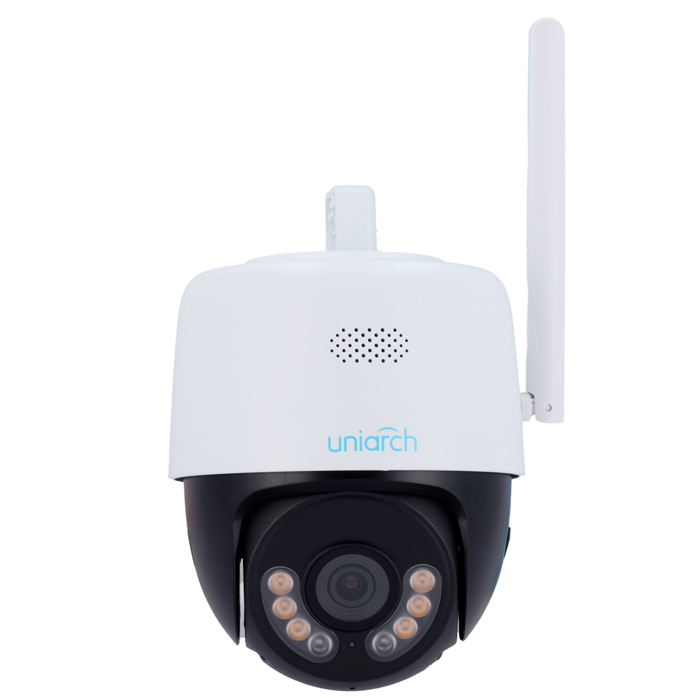 Cámara Domo PT IP Uniarch de 3 MP y con lente fija de 4 mm. Tiene la posibilidad de alertar con su altavoz y luz blanca para hacer más notoria la alerta.