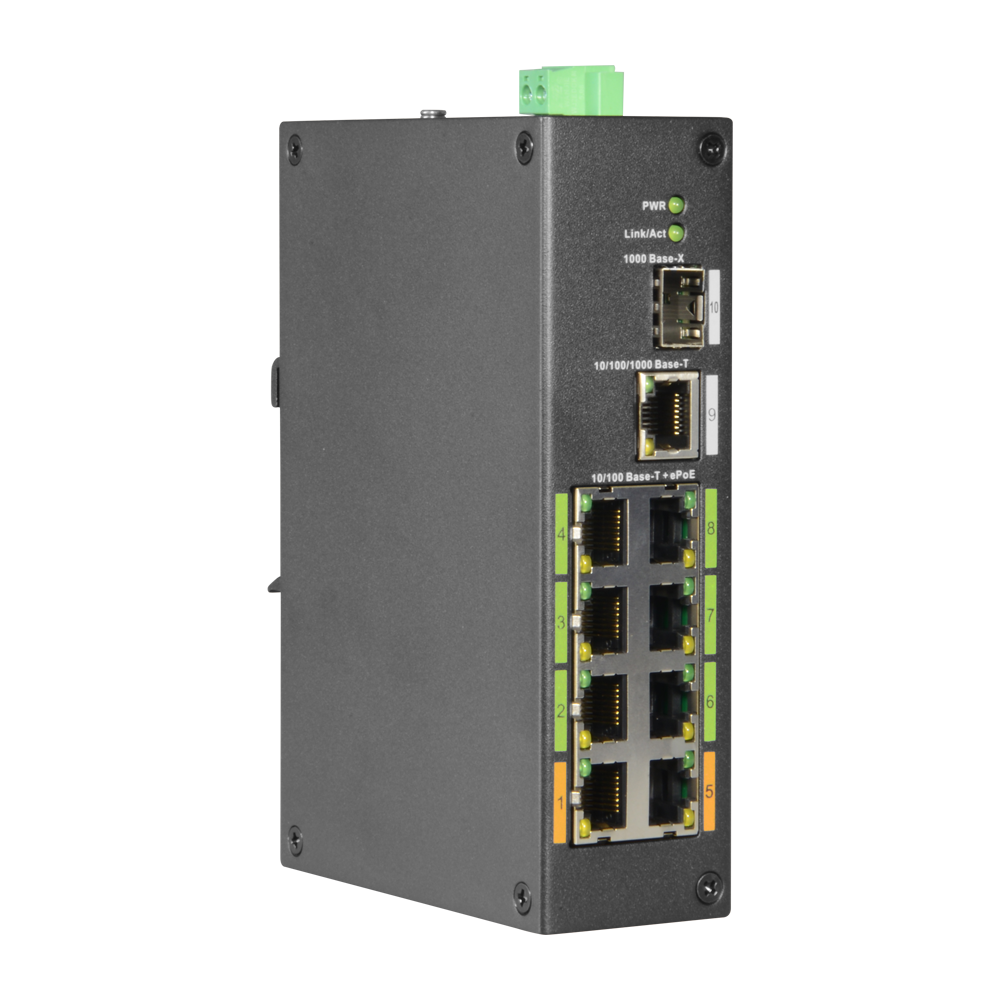 La robustez es intrínseca a su diseño “Hardened”, con una carcasa metálica que disipa el calor de forma pasiva y soporta condiciones ambientales severas. Incluye la función PoE Watchdog, que monitoriza el estado de los dispositivos y los reinicia automáticamente en caso de bloqueo, garantizando un sistema de videovigilancia siempre operativo. Con su puerto Combo Gigabit (RJ45/SFP), ofrece una flexibilidad total para el enlace troncal, asegurando que el flujo de datos masivo de los 8 puertos de acceso se transmita sin cuellos de botella hacia la red principal.