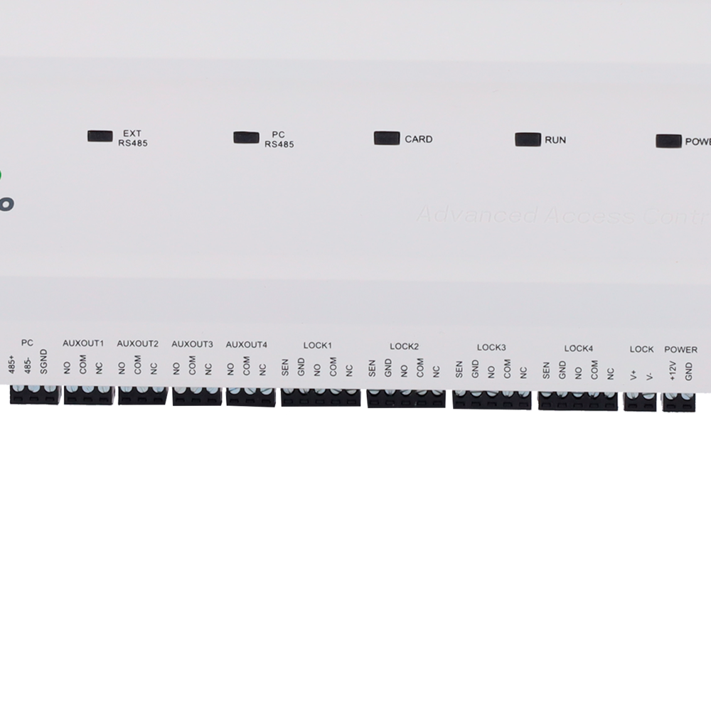 Las controladoras permiten gestionar varias puertas de manera simultánea mediante varias salidas de relé. Este modelo cuenta con 4 salidas de relé, siendo configurables como contacto seco (sin tensión) o contacto mojado (con tensión).